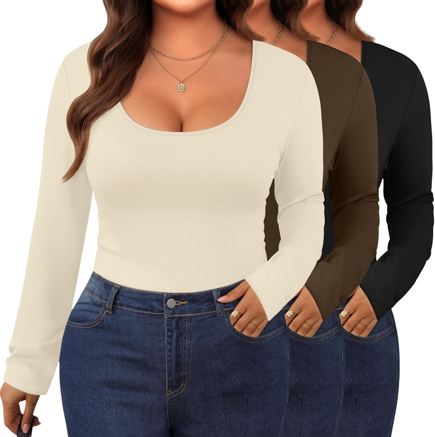 3 Pack Women's Plus Size Long Sleeve Shirts Scoop Neck Slim Fitted Top Casual Stretchy Base Layer Undershirts