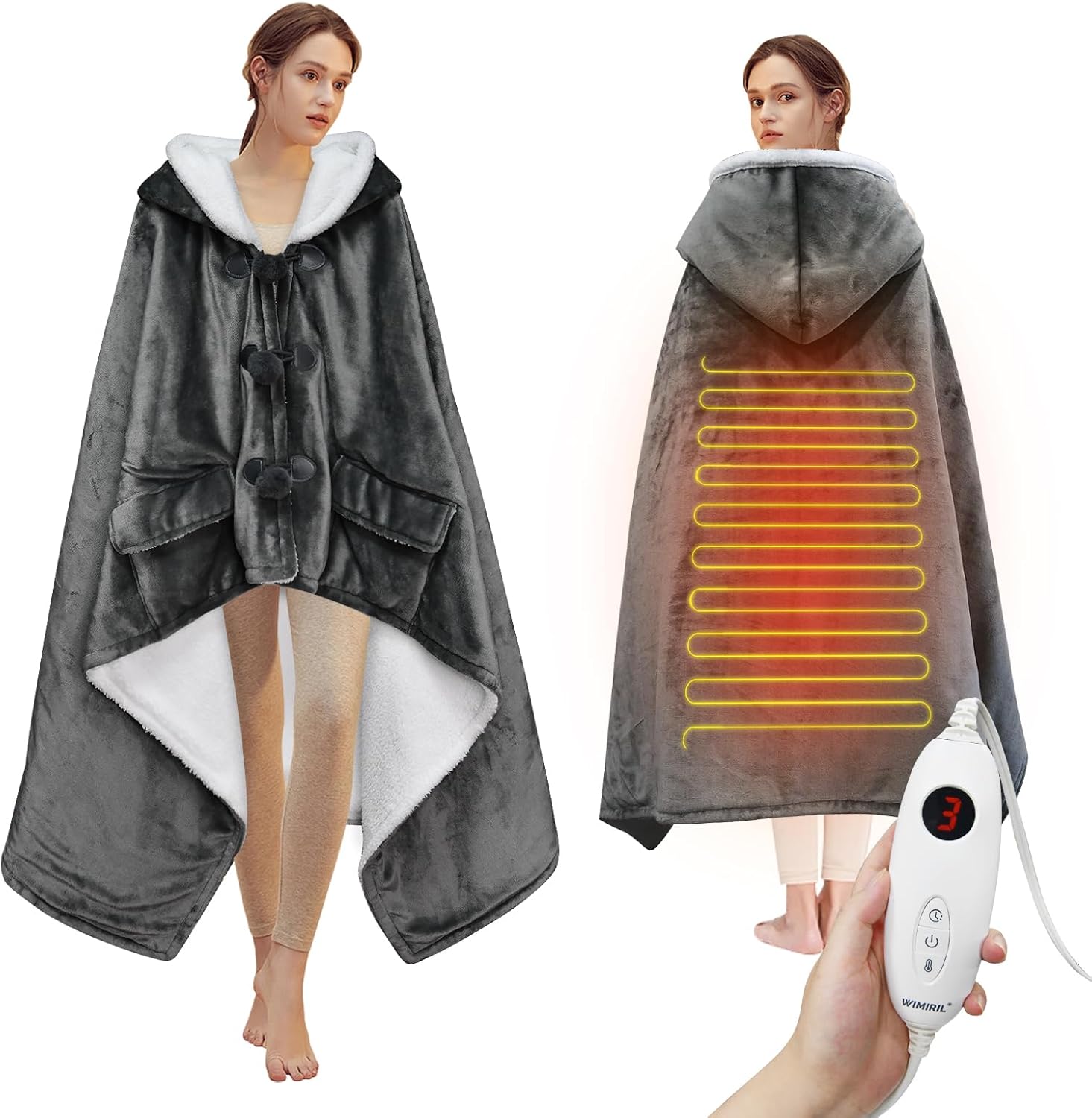 - 【Stay Cozy Anywhere】The WIMIRIL wearable heated blanket (50" x 70") is your ultimate comfort companion. Featuring spacious front pockets (7.5” x 8”), it's perfect for keeping your hands toasty and stashing essentials like your phone, snacks, or remote. Ideal for relaxing at home or staying snug on the move!