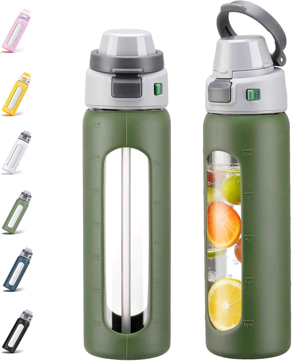 MUKOKO 2-in-1 Borosilicate Glass Water Bottle with Straw for Sports and Travel, 24oz Drinking Bottle with Silicone Sleeve, BPA Free, Leak Proof, Olive