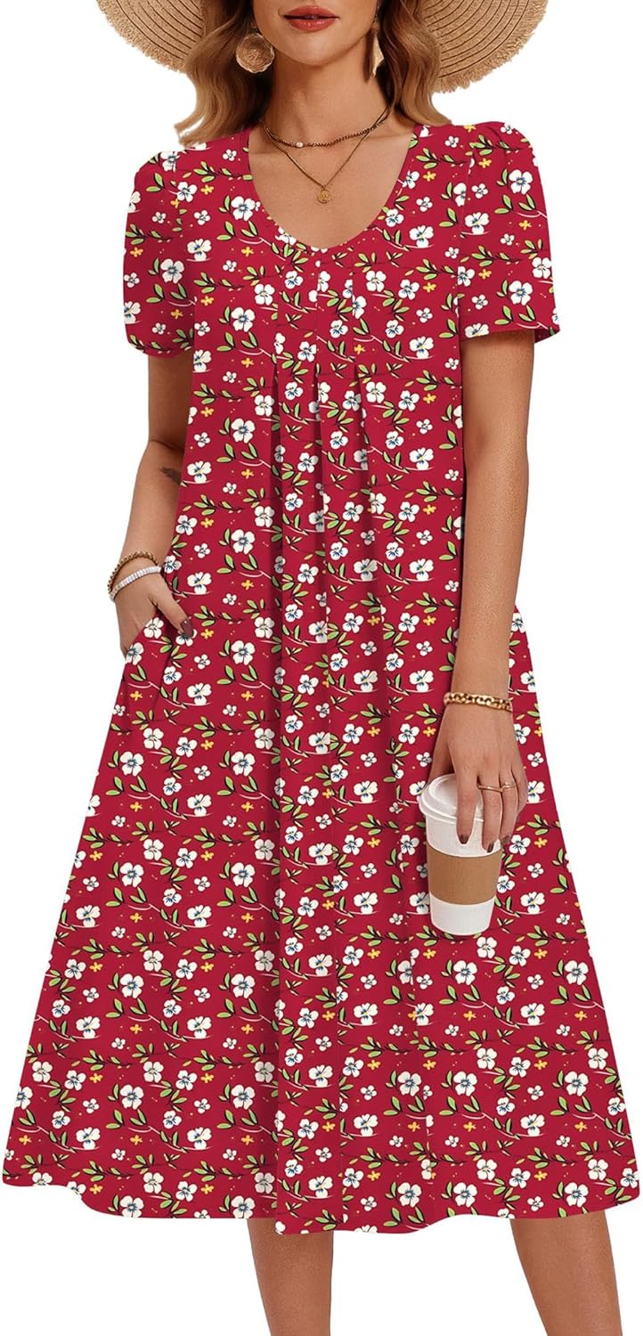 Zeagoo Summer Dress for Women Casual Floral Midi Sundress with Pockets V Neck Pleated Short Sleeve Aline Beach Vacation Dress