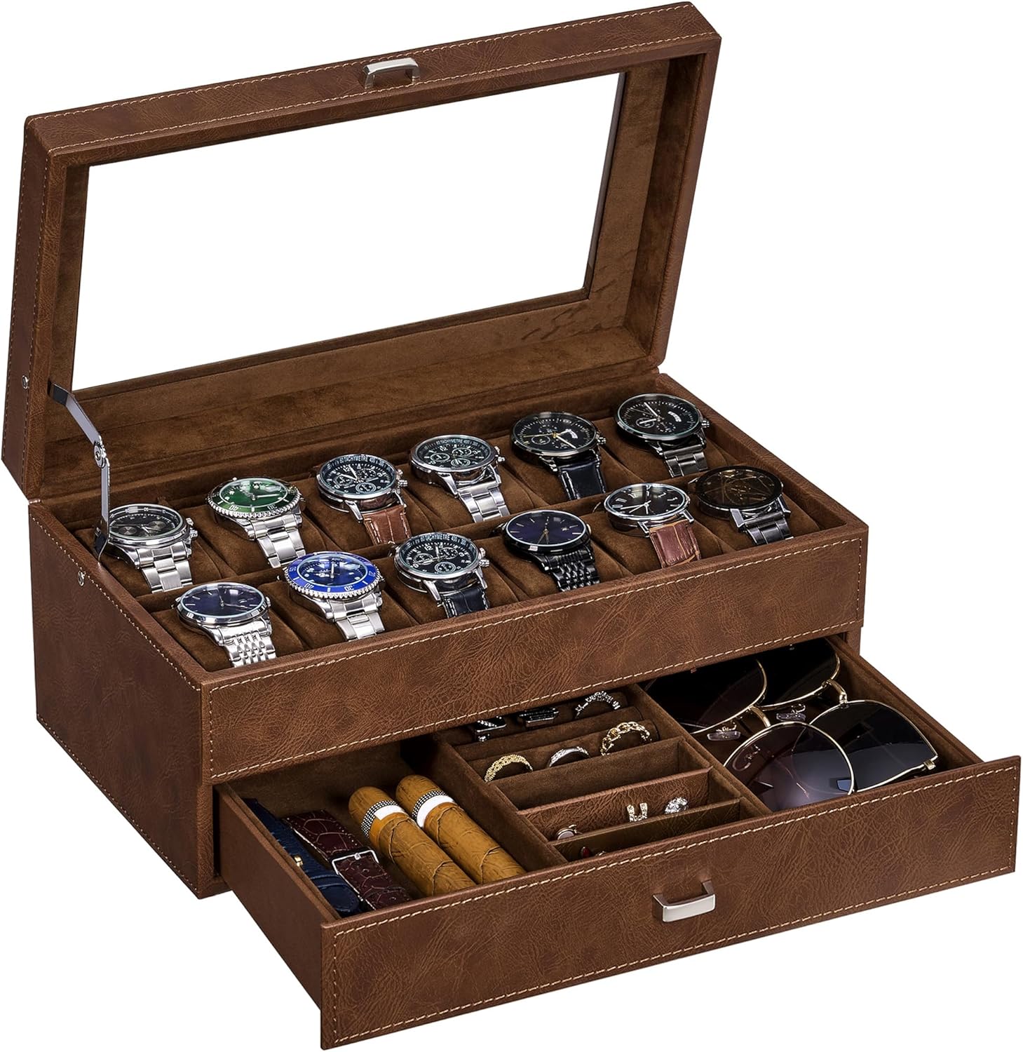 - [2-Layer]: This watch display case has 2-layer, The first layer offers 12-slots with removable watch pillows, the bottom drawer provides mens jewelry box, 1 ring case, 2 study earring cards, 2 more jewelry trays for necklaces, bracelets, cufflinks, wallets, keys, business cards, brooches and other jewelry accessories