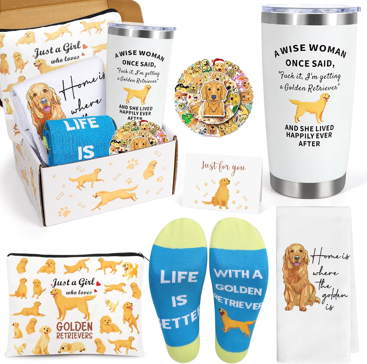 - Golden Retriever Gifts: This Gift Set includes 1*20 OZ stainless steel wine tumbler, 1*dish towel, 1* socks, 1* cosmetic bag, 1* stickers, 1* greeting card, 1* gift box.This practical gift set is rich in items to meet most people's needs, and its exquisite design makes it the best gift for golden retriever lovers