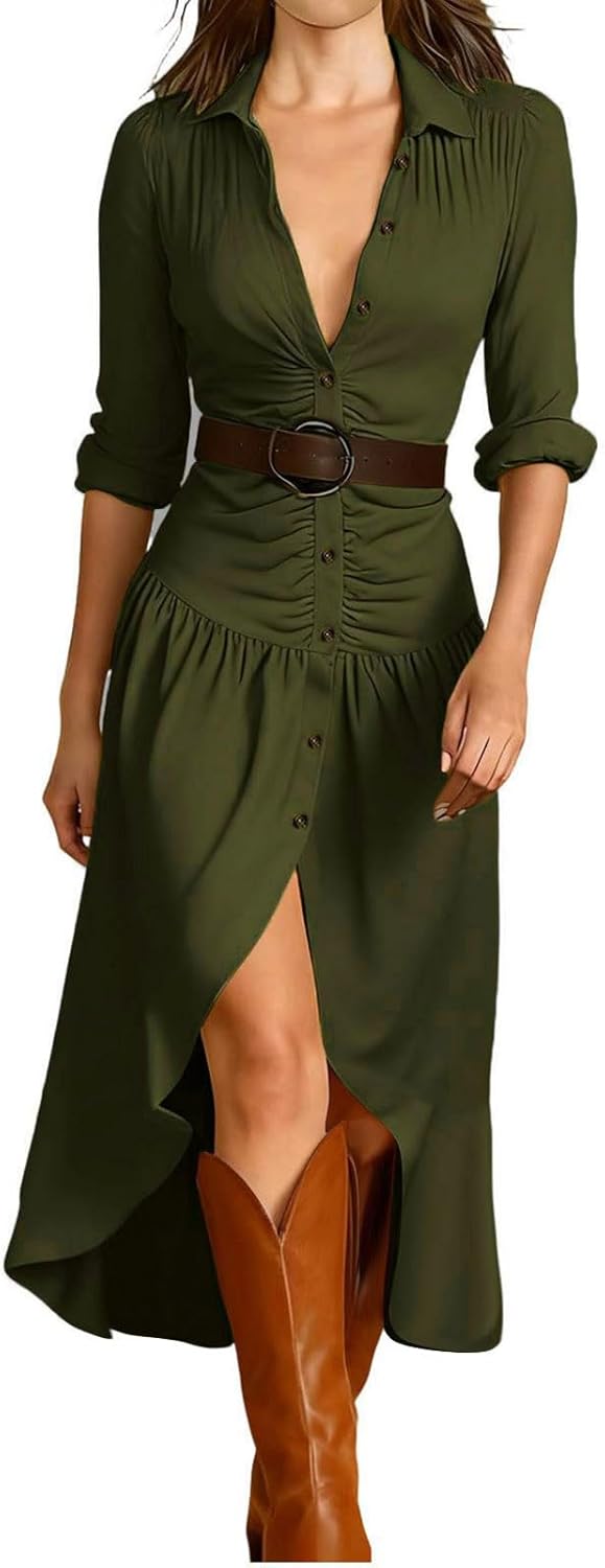 Womens Button Down Lapel Dress Western Cowboy Style High Low Hem Dress Fashion Long Shirts