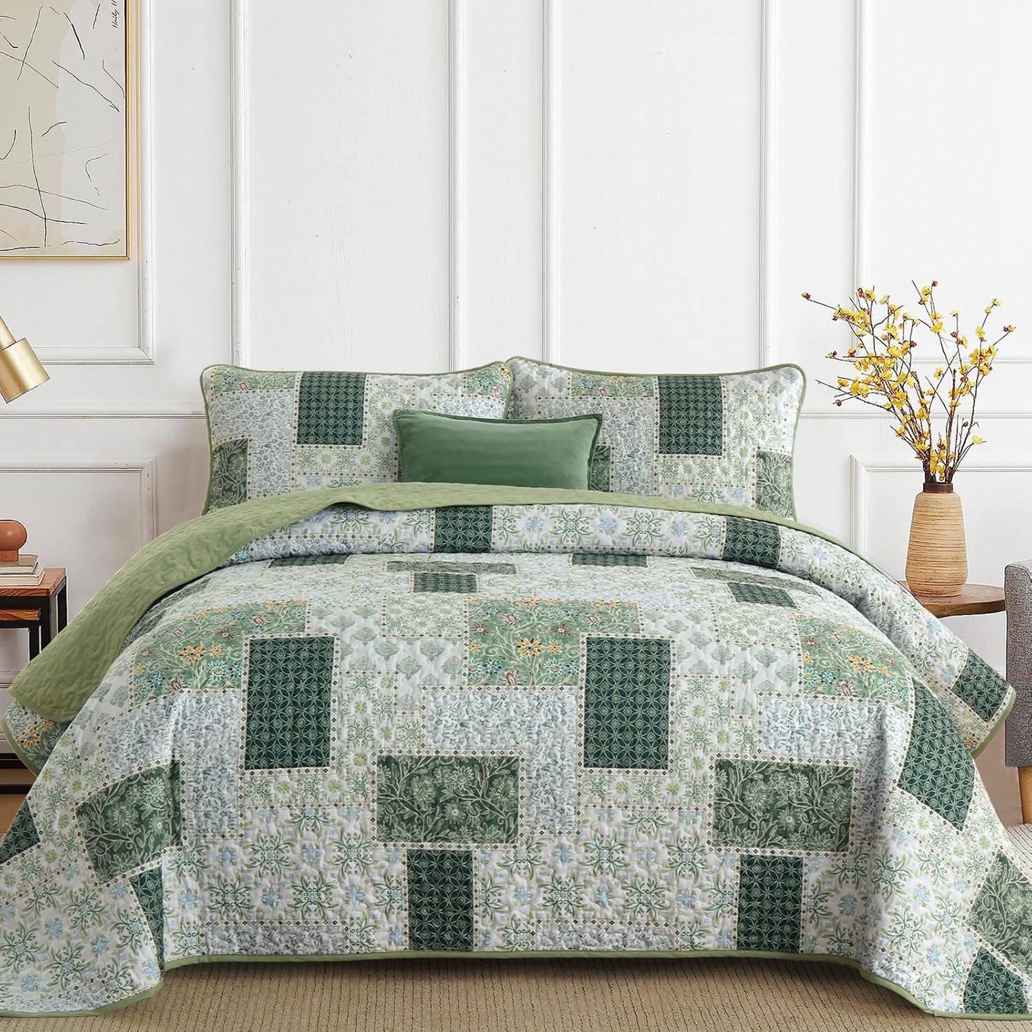Xruibed Patchwork Quilt Set Queen Size 3 Pieces Green Floral Plaid Bedspread Set Reversible Quilt Bedding Set Microfiber Bedding Bedspread Coverlet Set for All Season(Queen 96"x90")