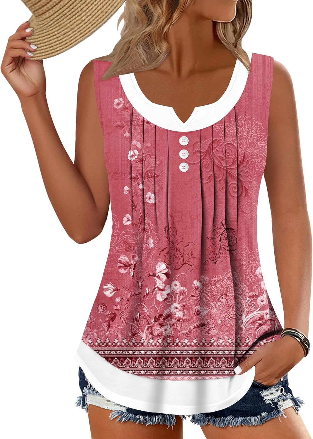 Womens Summer Tops Casual Scoop Neck Button Pleated Sleeveless Shirts Loose Fit Trendy Blouses