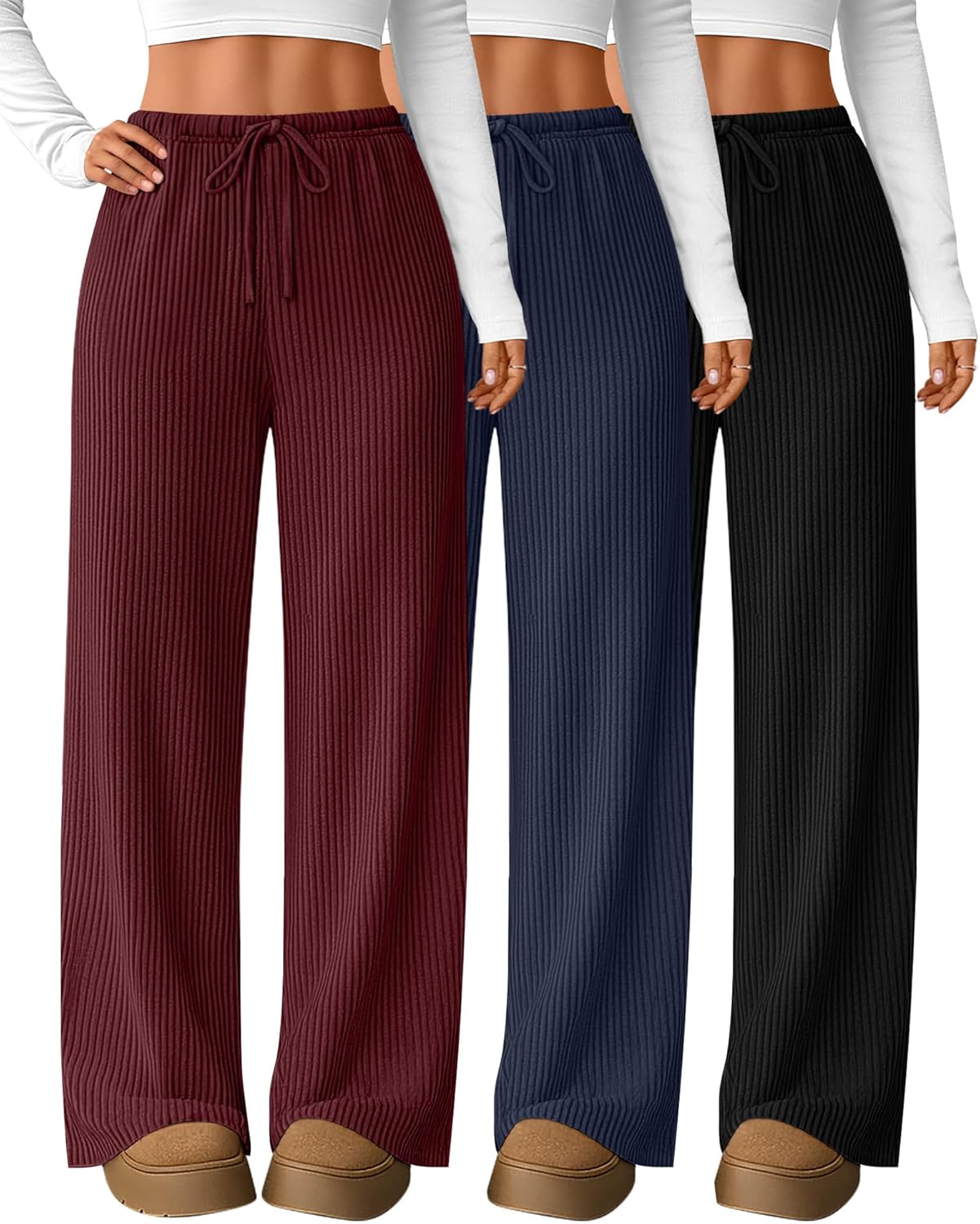 3 Pack Women Corduroy Drawstring Pants with Pockets High Straight Leg Elastic Waistband Casual Fall/Winter Trousers(Black, Navy Blue, Wine Red,XX-Large)