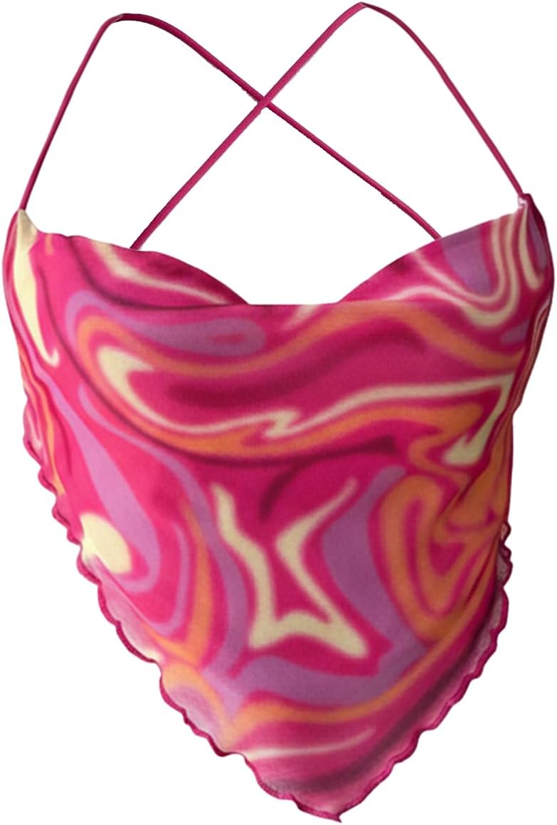 Floerns Women's Marble Print Halter Crop Top Tie Backless Asymmetrical Lettuce Hem Party Tops