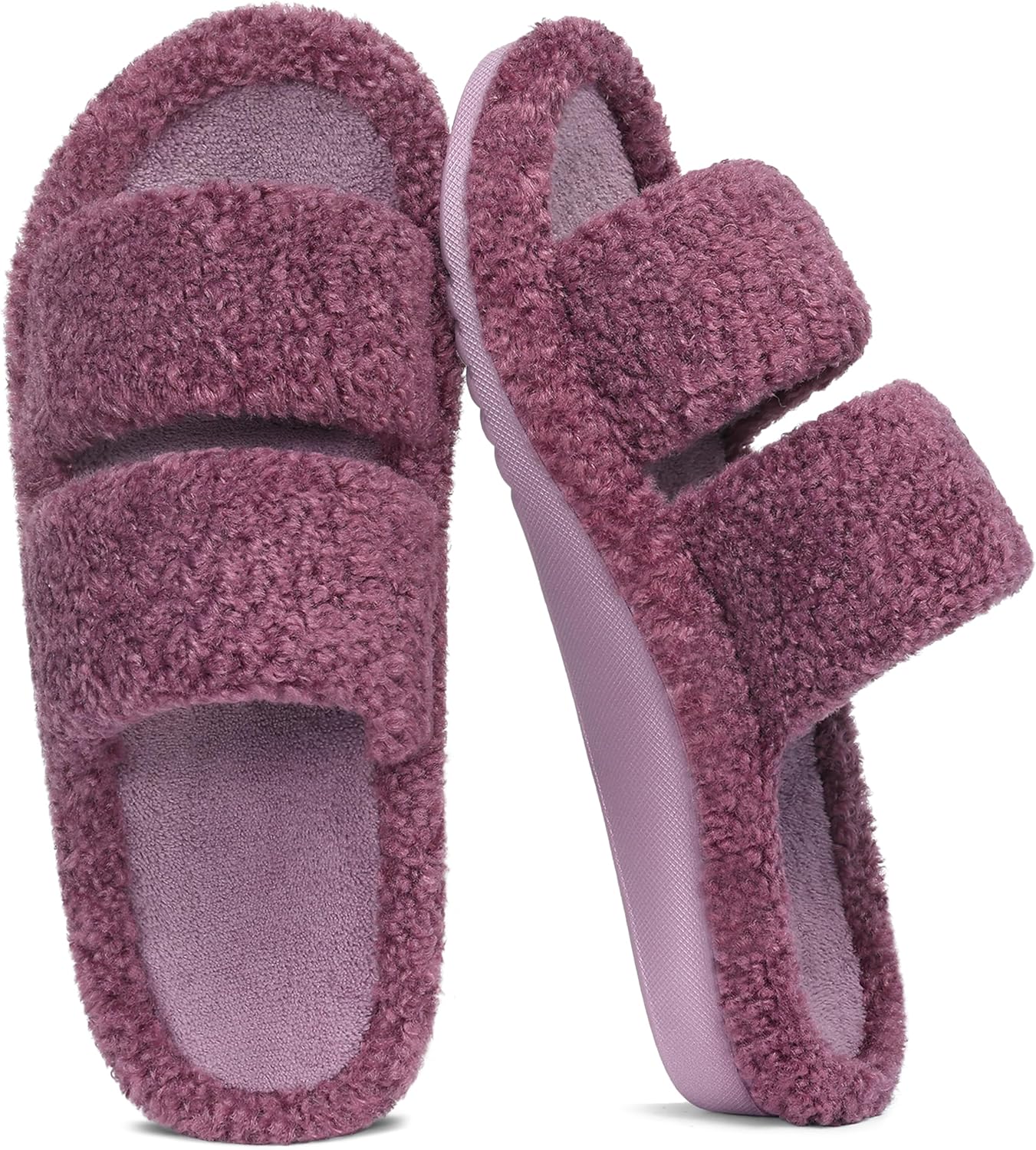 Litfun Women's Fuzzy House Slippers with Moderate Arch Support Open Toe Cozy Bedroom Shoes Indoor Outdoor
