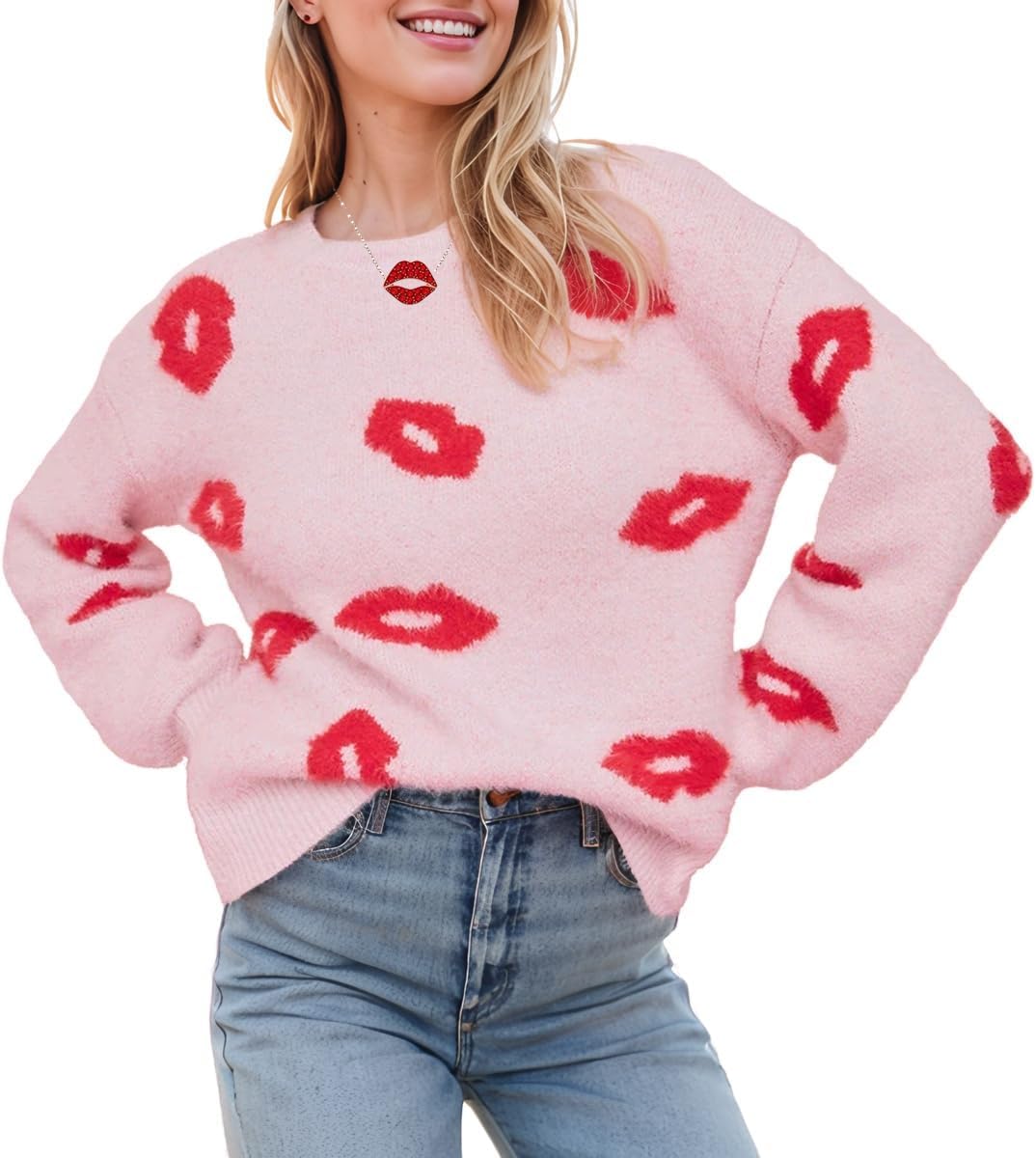 Sweater for Women Gift for Her Trendy Cute Lip Print Casual Fuzzy Long Sleeve Crewneck Sweaters Pullover Tops