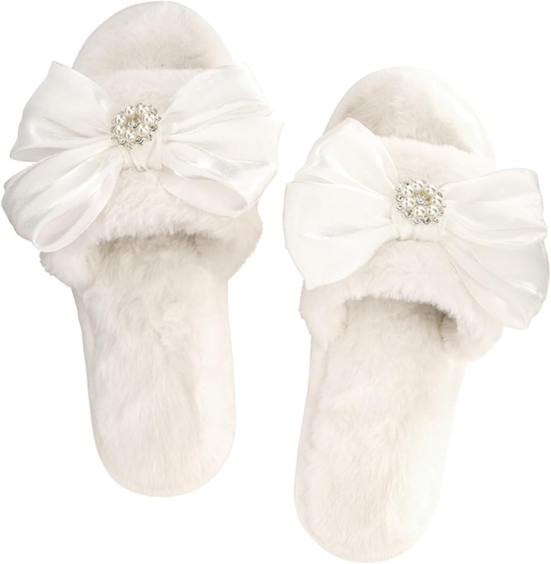 - FUZZY SLIPPERS Plush faux fur slippers with an adorable crystal-accent bow design that is chic and elegant