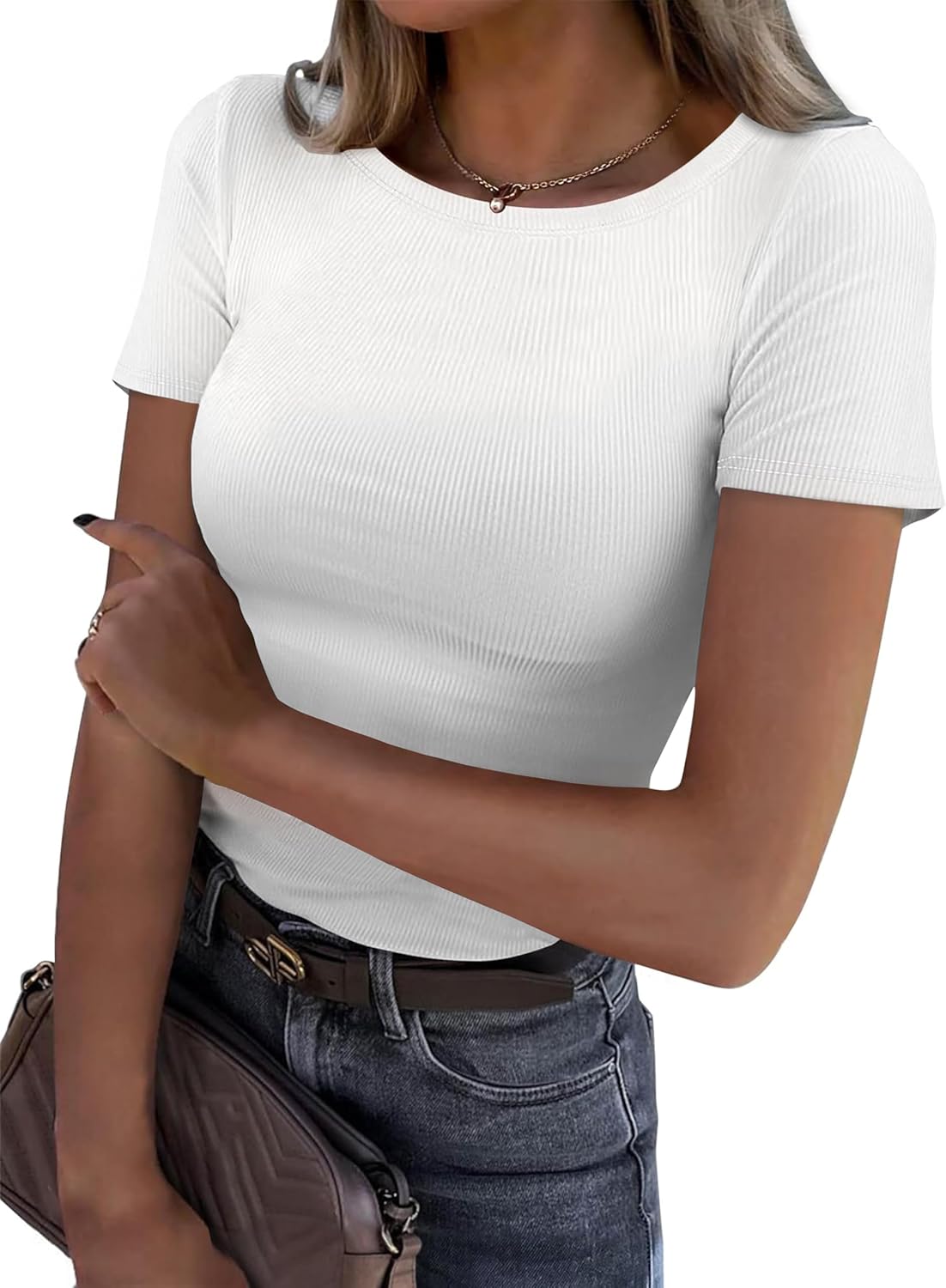 Womens Short Sleeve Tops Crew Neck Ribbed Slim Fitted Basic Tee Shirts Summer Tops Casual Spring Outfits 2026 Trendy