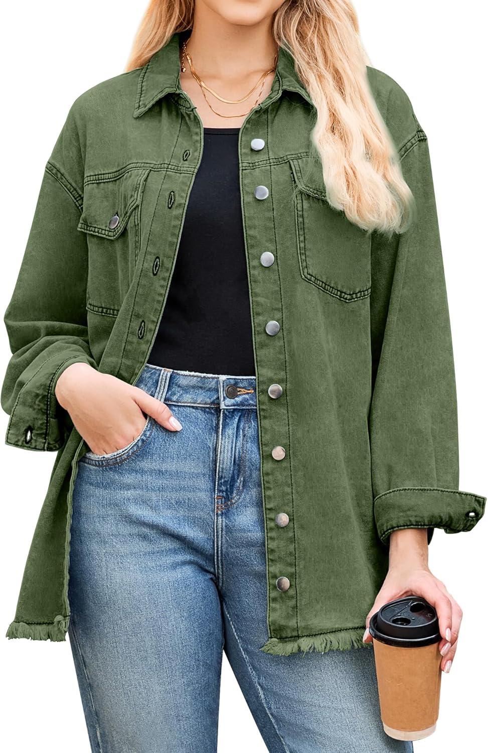 LookbookStore Jean Jacket Women Trendy Oversized Button Down Long Sleeve Frayed Hem Denim Shirt Jackets Distress Shacket