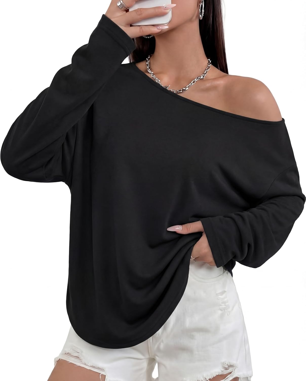 Women's Off Shoulder Tops Oversized Spring Long Sleeve T Shirts Loose Fit Casual Basic Tees Solid Color Blouse Tops