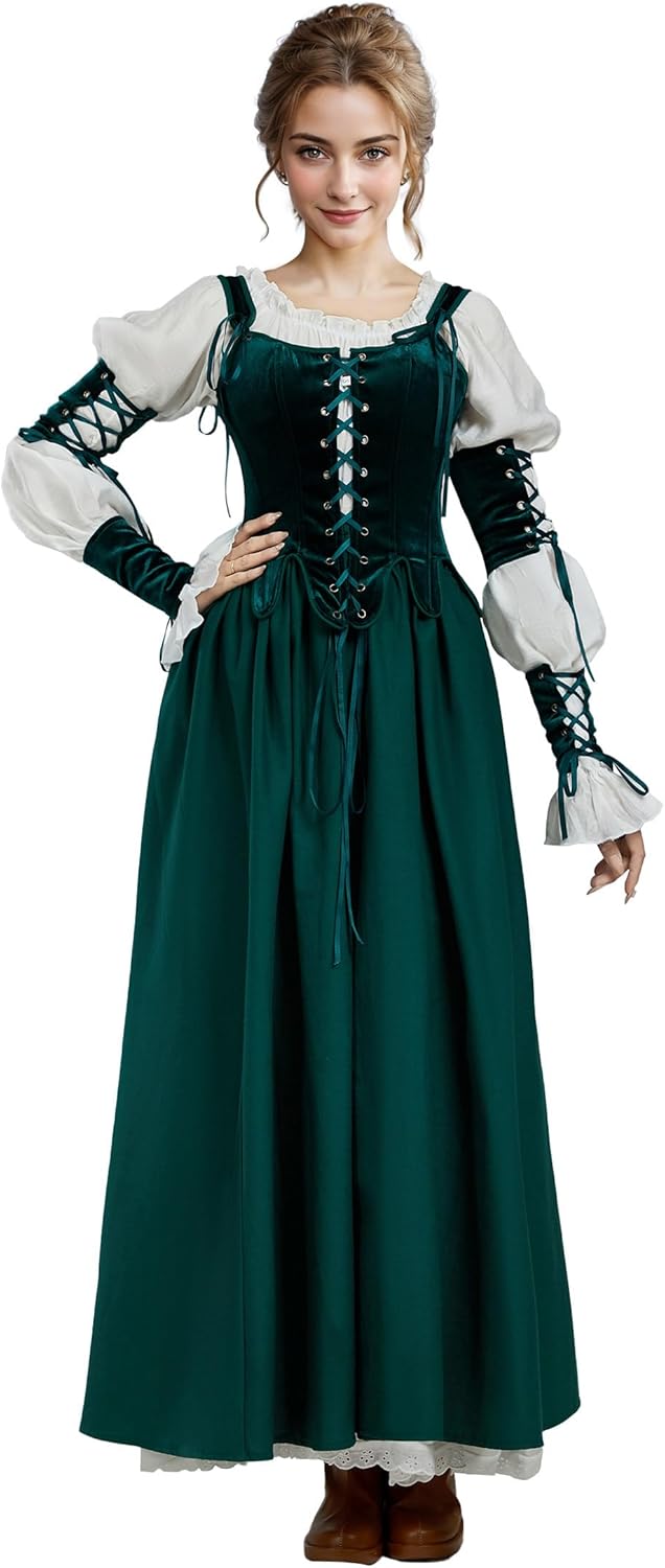 daizbella Women's Medieval Renaissance Costume Historical Retro Lace-up Dress Full Set for Role Play Party Halloween