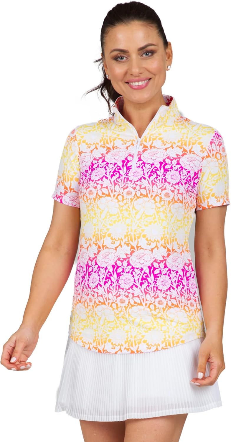 IBKUL Athleisure Wear Sun Protective UPF 50+ Icefil Cooling Tech Jesse Print Short Sleeve Mock Neck – 17538 Watermelon/Orange Jesse XS
