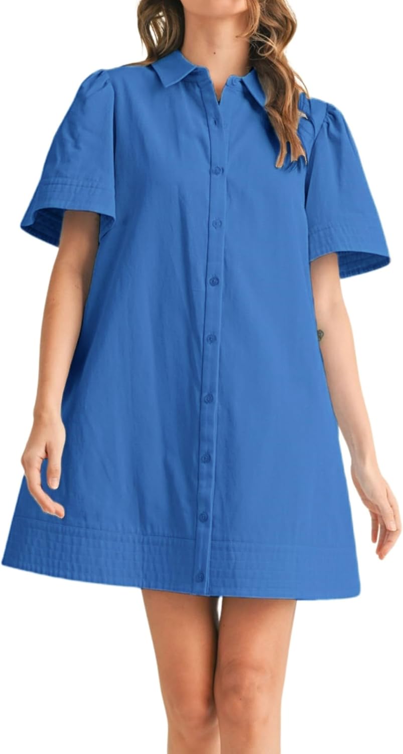 Womens Short Sleeve Button Down Mini Shirt Dress Lapel Collar Short Dresses with Pocket