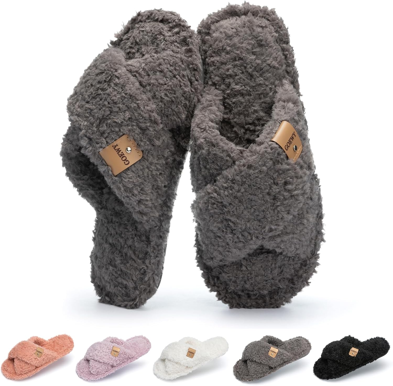 Fuzzy Open Toe Slippers for Women Indoor and Outdoor with Memory Foam Cozy Cross Band Women's Slipper Cute Soft House Shoes Slip On Gifts for Womens Mom Her Ladies Bridesmaid