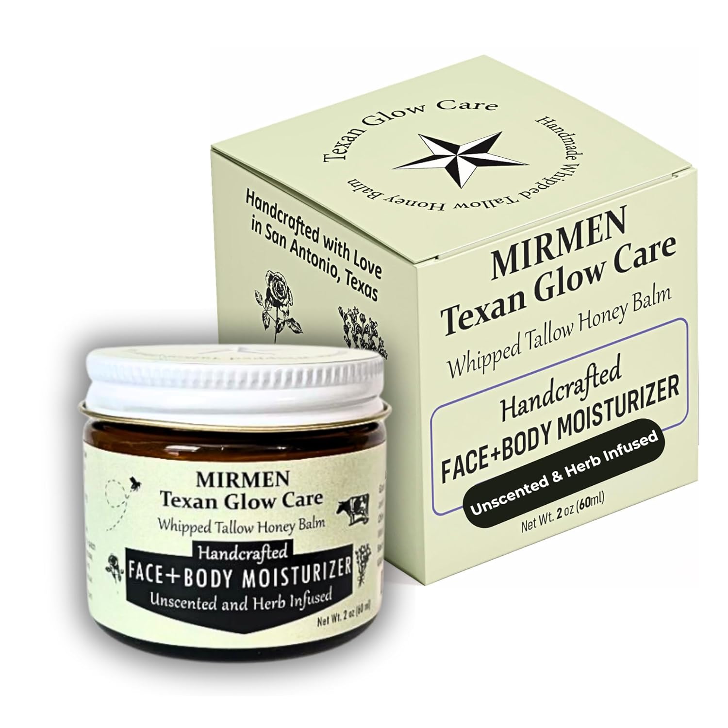 Whipped Tallow Honey Balm 100% Grass-Fed, All-Natural Moisturizer for Face & Body | Handmade for Deep Hydration (Unscented, 2 oz) | by MIRMEN Texan Glow Care