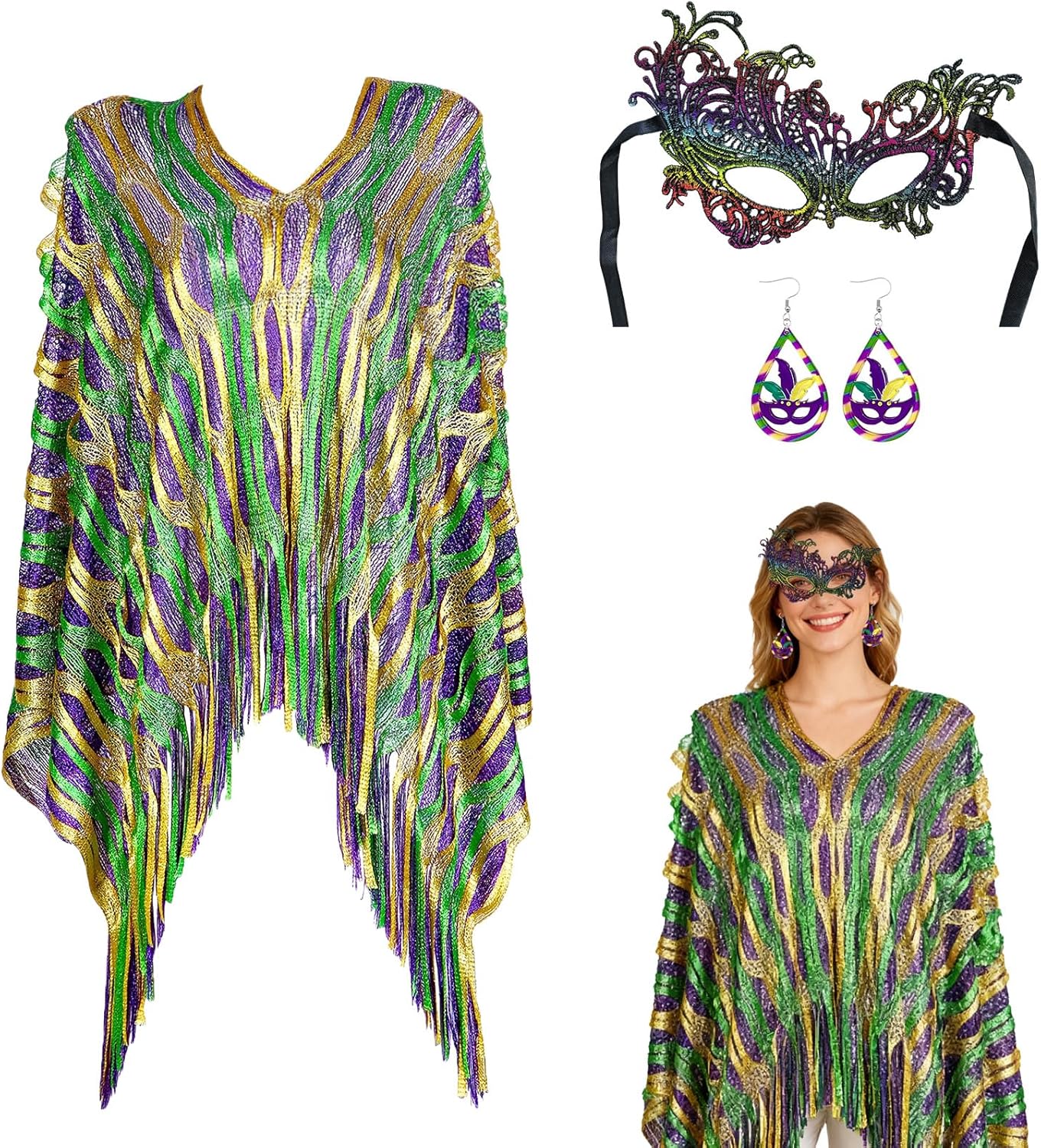 Mardi Gras Outfit for Women – Purple Green Gold Poncho Shawl Scarf with Matching Tassel Earrings and Mask, Lightweight Masquerade Cloak & Mardi Gras Accessories Set for Carnival Party Parade
