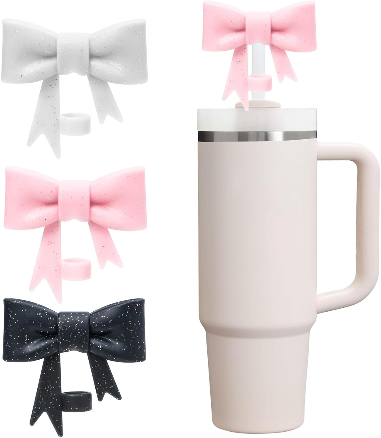 3Pcs Glitter Straw Covers for Stanley Cup, 10mm Bow Straw Topper, Silicone Cap Dust Plug for 30oz & 40oz Tumblers, Tumbler Accessories Gift for Women
