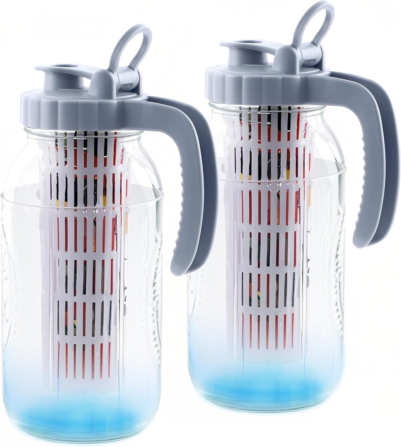 Mason Jar Pitcher With Fruit Infuser 2 Quart Water Pitcher With Pour Spout Lid 2 Pack Half gallon Wide Mouth Glass Carafe For Milk, Fruit Infused Water, Iced Tea, Lemonade, Cocktail, Cold Brew Coffee