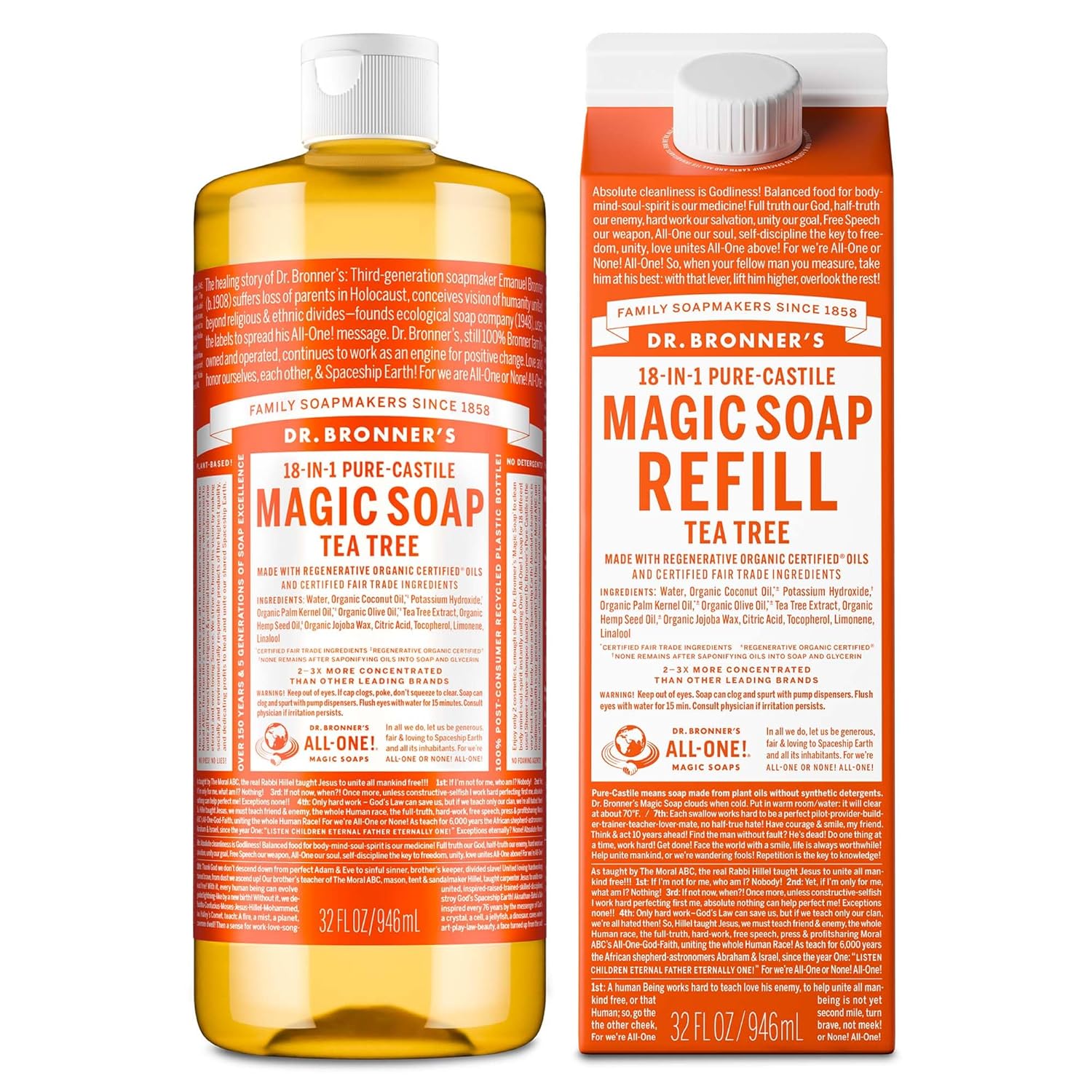 Dr. Bronner's Pure-Castile Magic Soap Liquid- Made with Regenerative Organic Certified Oils- For Body, Face, Hair, Dishes, Laundry, Vegan Bath Soaps for Men & Women, Non-GMO- Tea Tree, 32oz + Refill