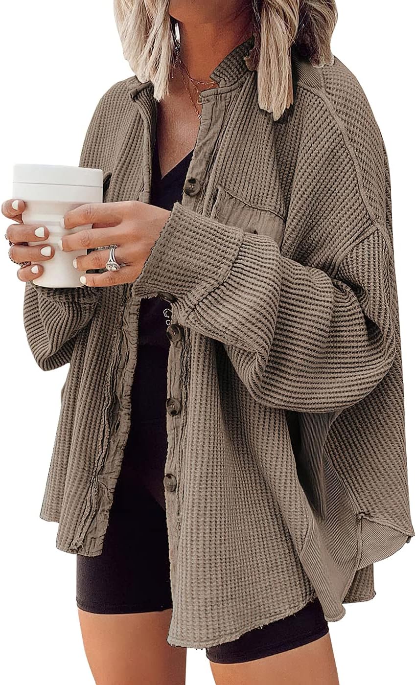 Womens Waffle Knit Shirt Button Down Long Sleeve Lightweight Slouchy Boyfriend Blouse Shacket Tops