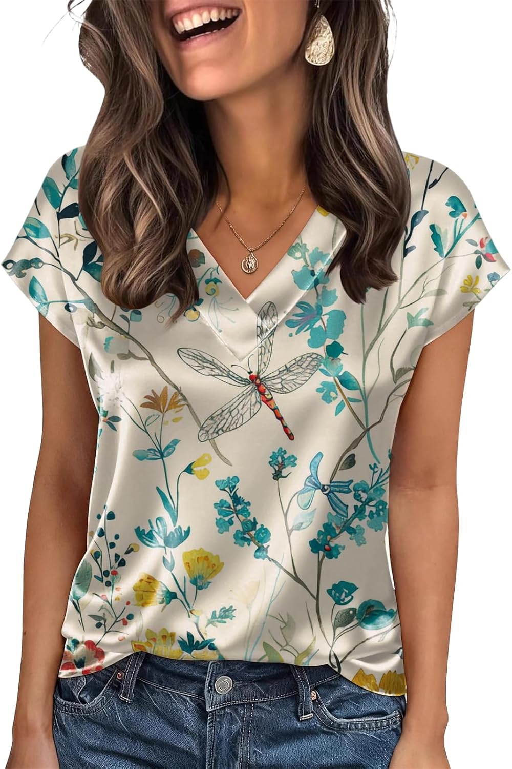 Women Silk Satin Tops Short Sleeve Blouse V Neck Loose Fit Shirts Business Casual Outfits