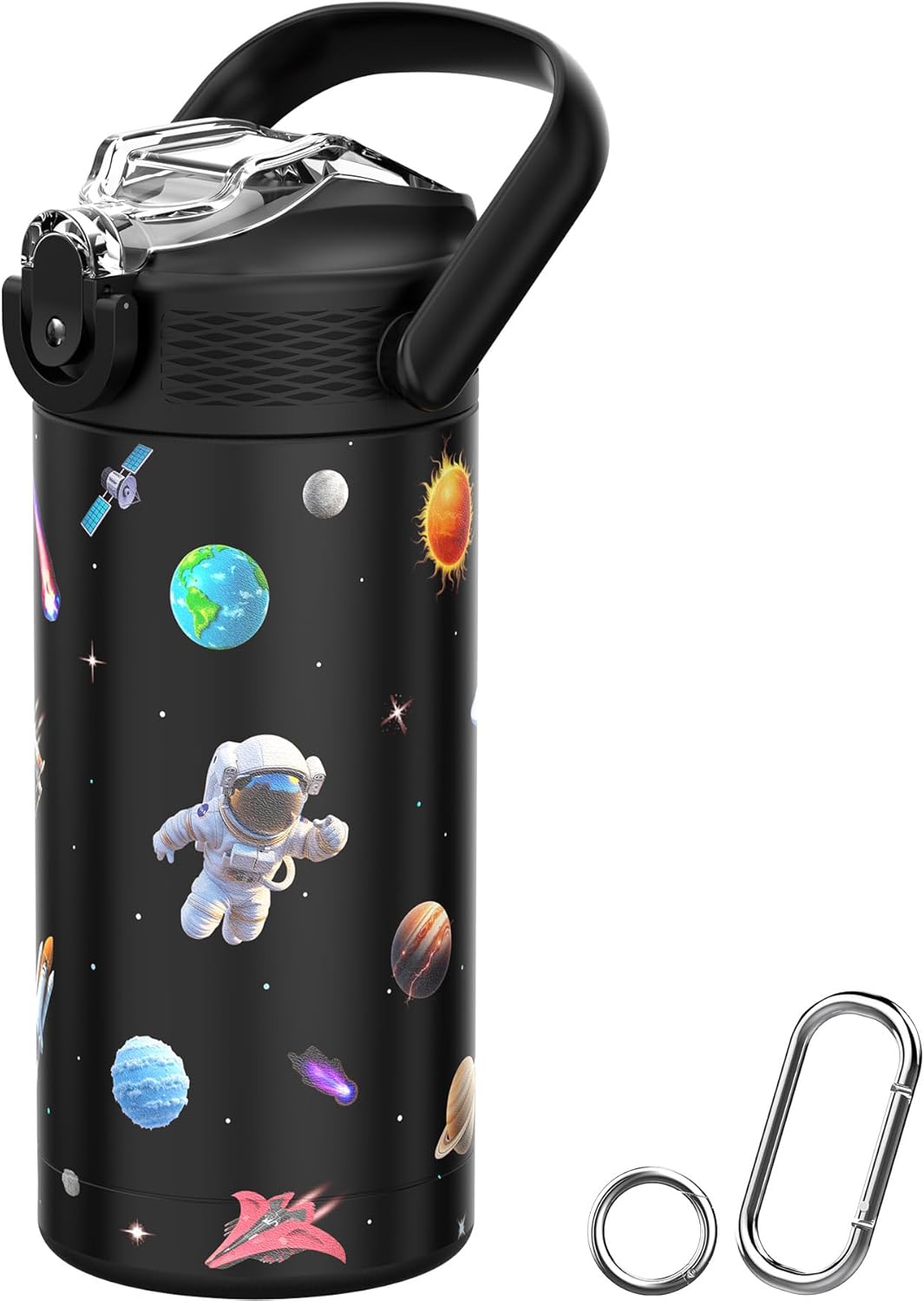 - Pattern: Black universe background, various high-resolution astronaut, solar planets, rockets and cosmos wonders in chibi and sci-fi styles — 3D touch texture offers extra cuteness. ● Accessories: Includes a tiny round spring gate ring and a larger 2" (5 cm) long carabiner for easy latching onto a backpack — enjoy on-the-go fun & hydration. ● NOT A TOY. For children aged 4 years or above only.