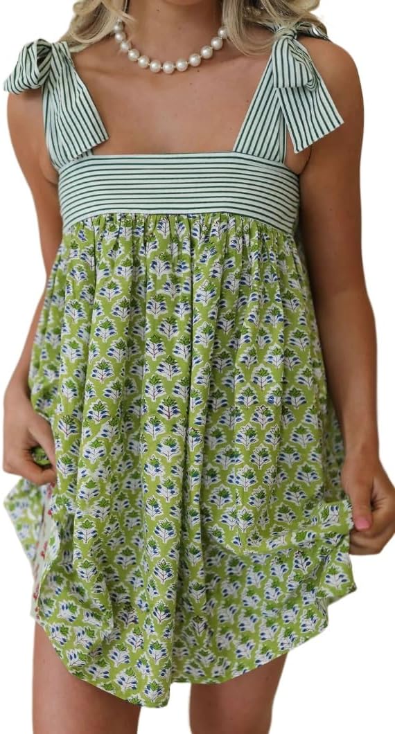 Womens Boho Floral Mini Dress Summer Cottagecore Striped Flowy Smocked Spaghetti Strap Coquette Vacation Sundresses