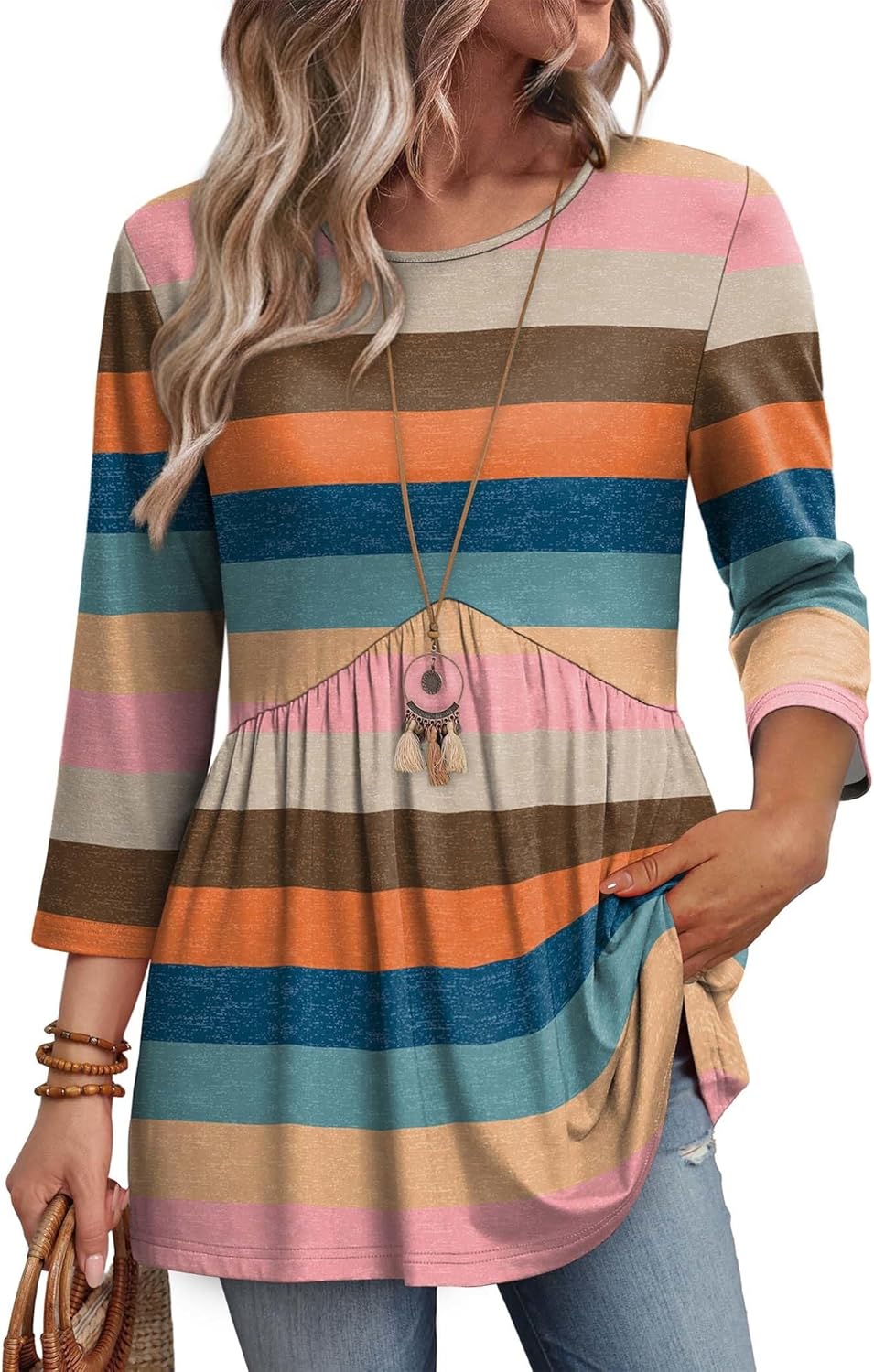 3/4 Length Sleeve Womens Tops Blouses for Women Dressy Casual Spring Fashion Clothing Crew Neck Babydoll Tops