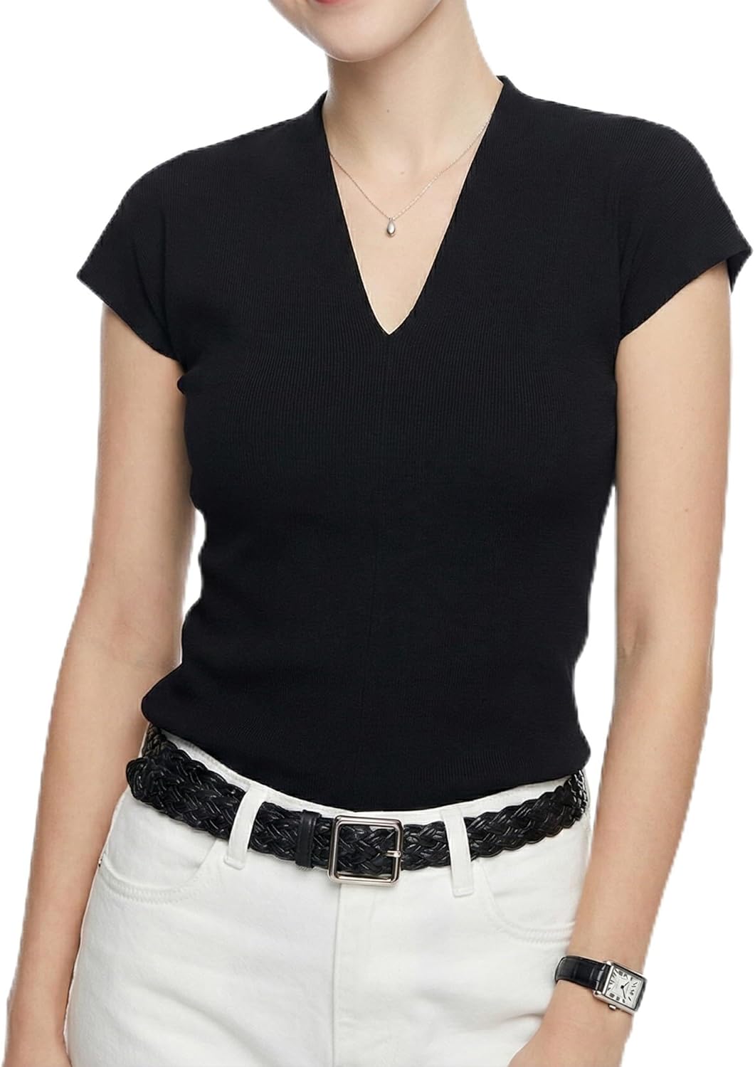 Trendy Women Ribbed Top V-Neck Short Sleeve Lightweight Tight Work Pullover Petite Black S
