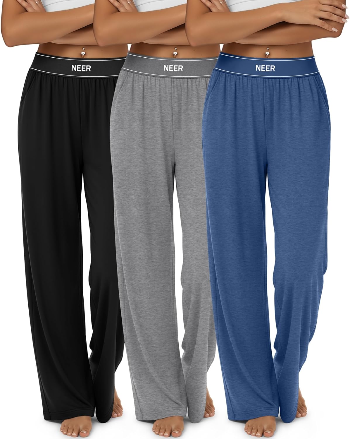 Neer 3 Pack Women's Cotton Lounge Pants High Waisted Wide Leg Yoga Pants Casual Comfy Athletic Loose Sweatpants with Pockets