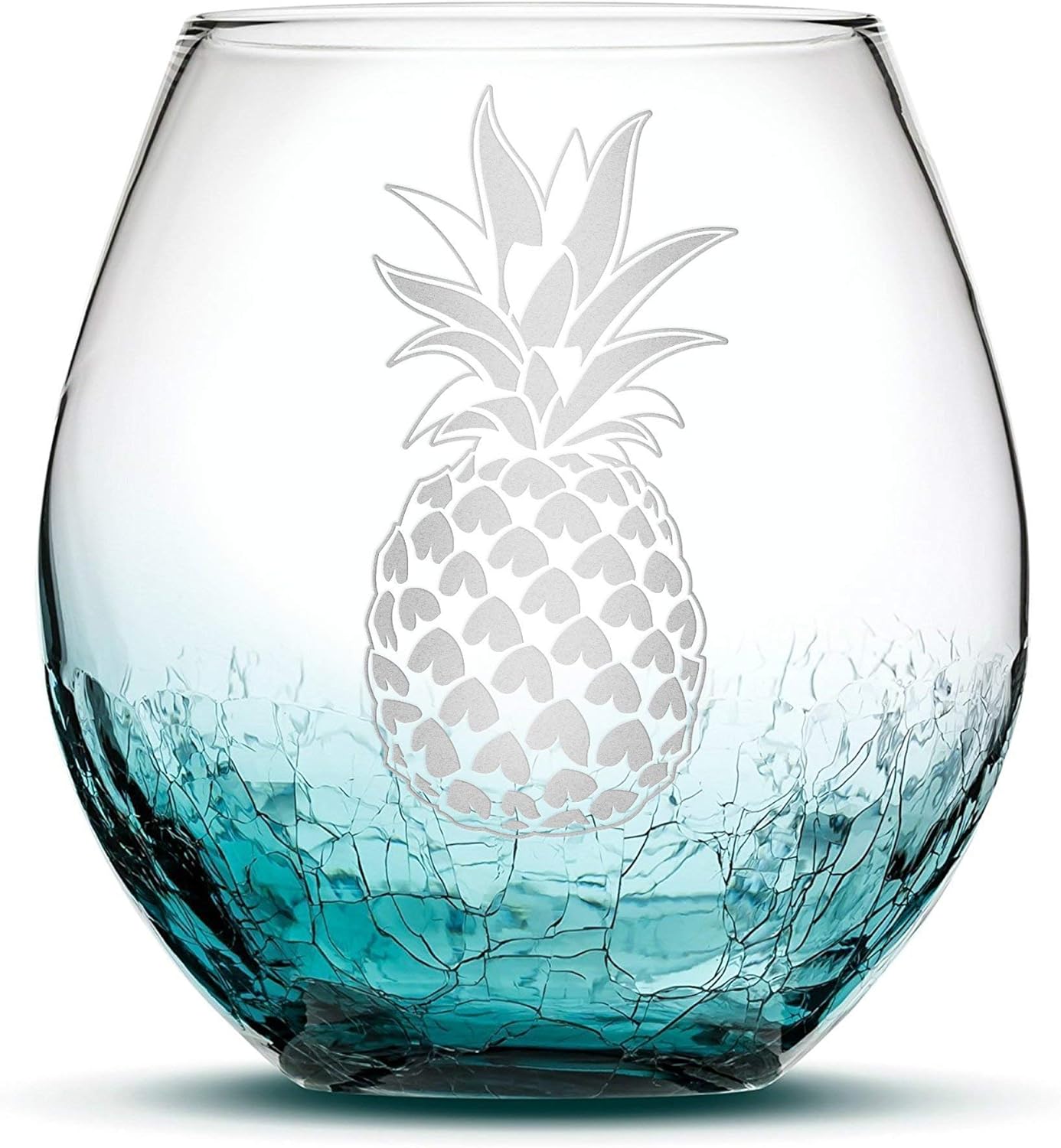 Integrity Bottles Tropical Pineapple Design Stemless Wine Glass, Handmade, Handblown, Hand Etched Gifts, Sand Carved, 18oz (Crackle Teal)