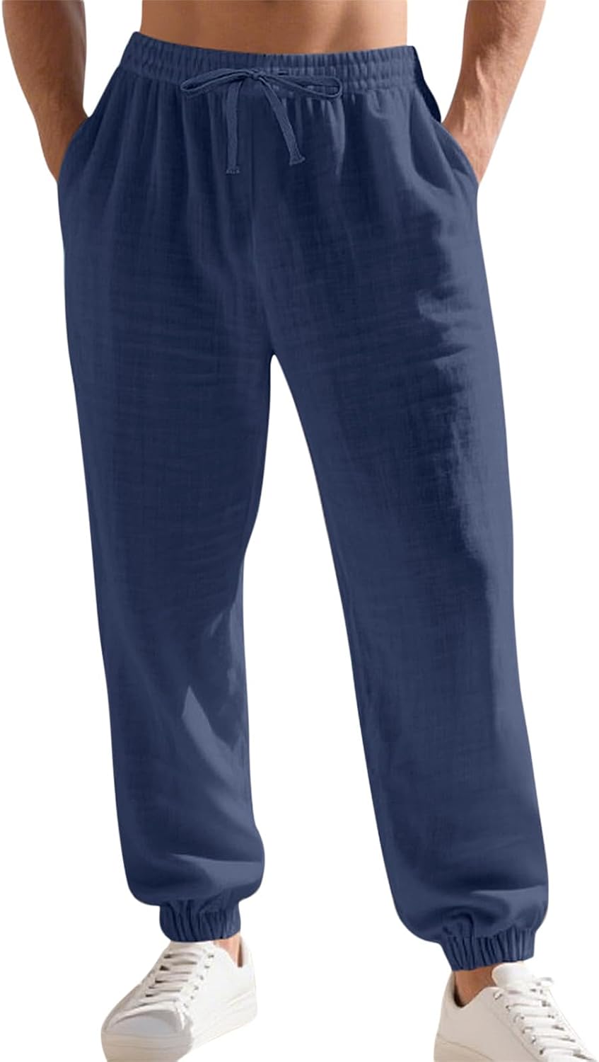 Men's Linen Joggers Summer Beach Lightweight Drawstring Yoga Pants with Pockets & Elastic Cuffs