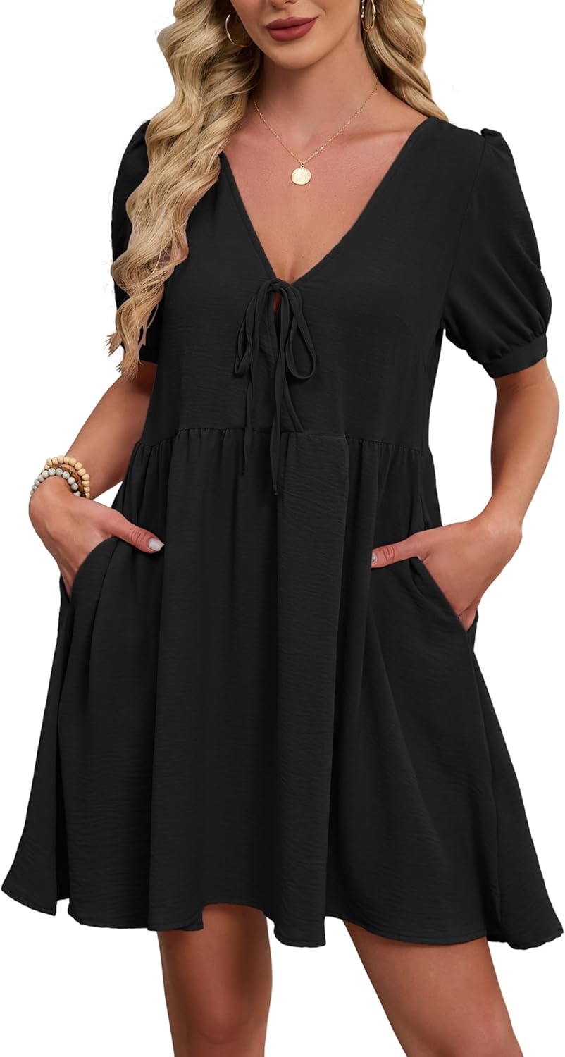 Kikibell Womens Summer Dresses A Line V Neck Tie Front Babydoll Dress with Pockets Flowy Trendy Mini Beach Casual Outfits