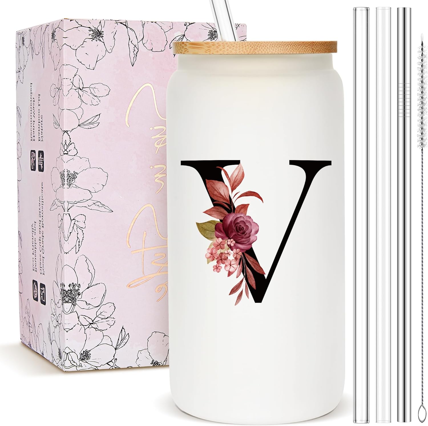 Personalized Gifts for Women, Monogrammed Frosted Glass Tumbler with Straw and Lid, Cute Customized Mug, Custom Initial Iced Coffee Glasses, Customizable Drinking Cup, Birthday Teacher Woman, V