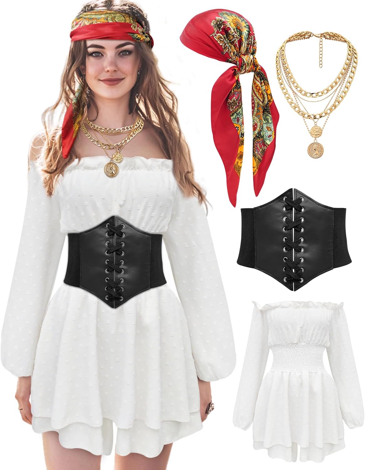 Women Pirate Costume Dress with Corset Accessories Long Sleeve Romper Short Off Shoulder Dress