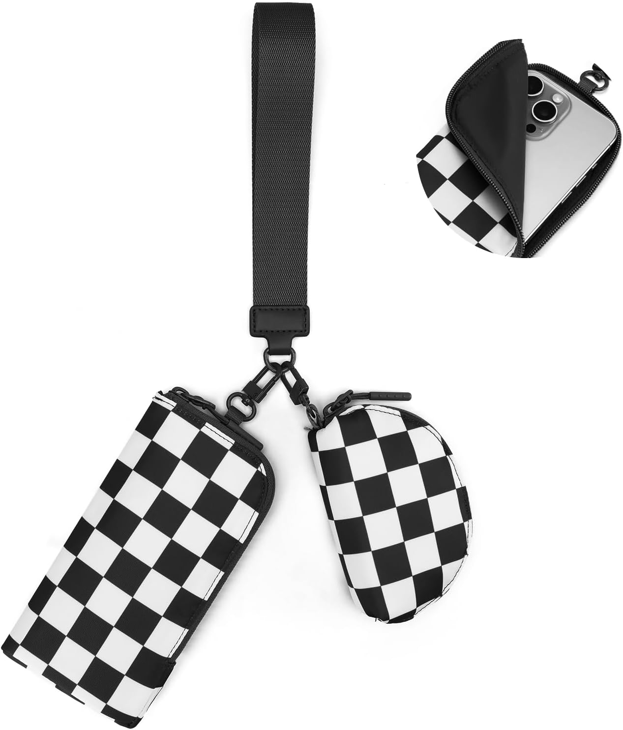 Checkered Dual Pouch Wristlet Wallets for Women Fits Phone Small Travel Zip Around Wallet with Coin Purse