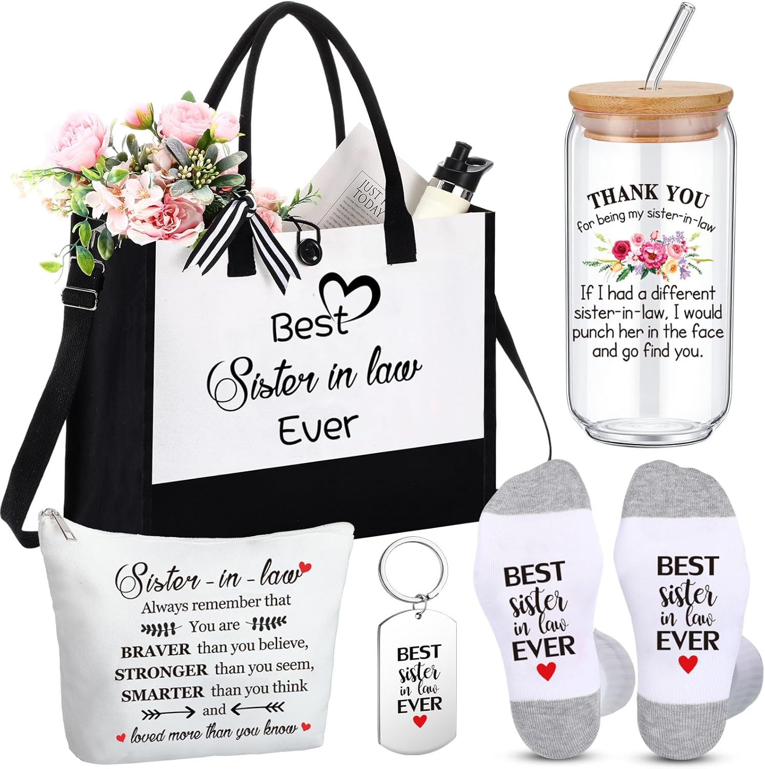 - Exquisite Gift Set: you will receive a sister-in-law glass with a straw and a cleaning brush, a large tote bag, a makeup bag, a sister-in-law themed keychain and a pair of socks to surprise your sister-in-law with this practical gift that tells her how much she means to you