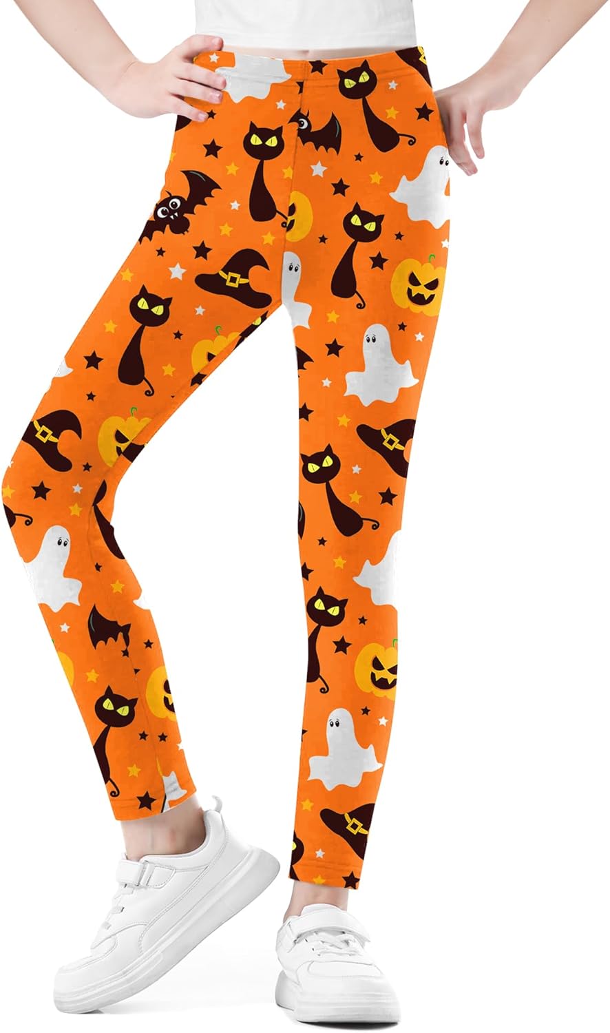 Girls Halloween Skinny Stretchy Leggings Printed Cute Witch Graphic Tight Pants Orange Pumpkin Ghost 9-10 Years