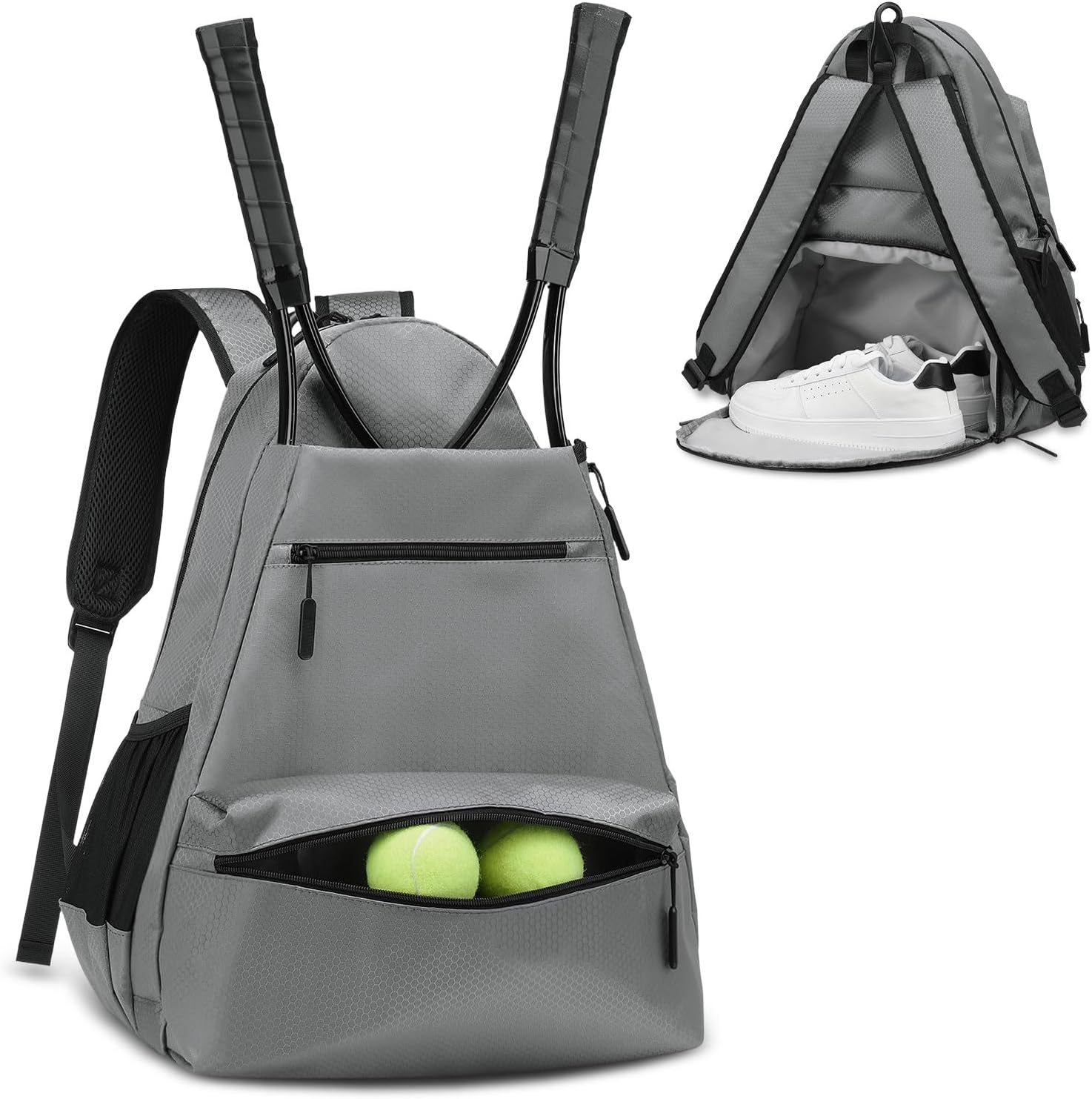 - -Separate Shoe Storage- --Rear shoe compartment keeps dirty shoes isolated from other items. Holds up to US men's size 11.5 sneakers, keeping your tennis or pickleball gear cleaner and more organized